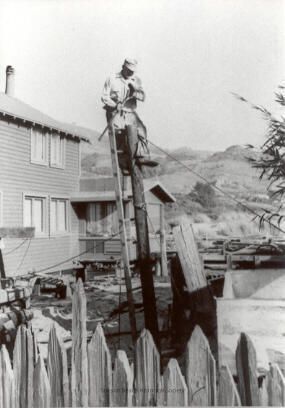 C.J. Greene, in a railroad cap, stands atop a ladder that is tethered to a telephone pole(?) beside the house at 24 Calle del Pinos. Holding a long-ish tool, he is working hard at something at the very top of the poleCollection