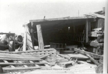 A gaping hole in the skeletal remains of a structure (garage/shed?) at #24 Calle del PInos is all that remains after the February 2, 1960 storm. Wooden debris litters the foreground.Collection