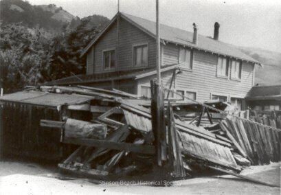 Street view of tumbled down fence in front of 2-story house on Calle del Pinos after the storm of Feb. 2, 1960.Collection
