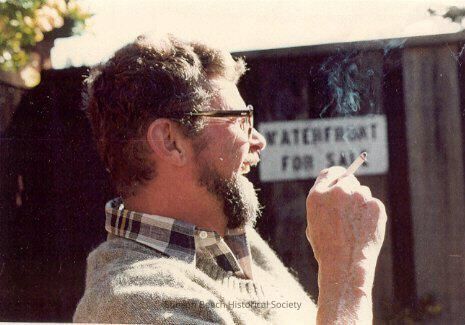 This color photograph is of a man (Jack Richardson) in profile from the shoulders up. He is facing right and his right wrist and hand, holding a cigarette, are visible in front of him. He has curly light brown hair, a mustache and goatee. He is wearing horn rimmed glasses and a grey pullover sweater showing a plaid shirt collar. He is laughing or smiling. Behind him is a dark wood fence bearing a sign that says 'WATERFRONT FOR SALE'.Collection