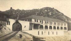 This is a black and white photogragh yellowed with age. It is of a long white building (a railway station). The building has a second floor which juts out and is supported by arches running the length of the structure. Coming from the left are railway tracks which go through an arch in what appears to be an annex to the building. The buildings are on a hillside and underneath the long building and below the level of the tracks there is a cement retaining wall that has windows or vents in it. The upper portion of the building, above the arches, has eight pairs of windows along the length of it. Windows are also visible along the end of the building. A mountain rises behind the station,(Mount Tamalpais). There is a dark building above and behind the station on the left side of the picture.Collection