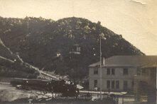 This black and white photograph shows an engine pulling two cars. It is moving toward the arched portion of the station at the far right . Behind the track is a portion of the station that has a first and second floor. There is a flag pole in the foreground and Mount Tam in the background.Collection