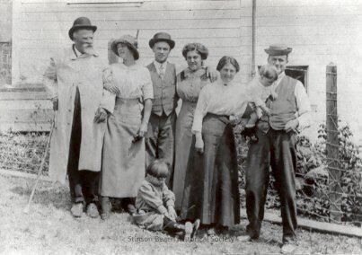 Family Photo beside house. Pictured l. to r.: Guiseppe Pistolesi in trenchcoat, bowler hat and holding a cane; on his arm is Alice Kelly long skirt, blouse and chapeau; Gustave D. Harper (father of Ed, Harold and Regina) in vest, tie and bowler hat with his arm over the shoulder of Regina Pistolesi (mother) in long dress with fitted bodice; Mamie Pistolesi with her husband Frank (Sausaltio Councilman). She is in long sleeve blouse and ankle length skirt; he in pants, shirt, vest and brimmed hat on top of his head. He is holding one of their small children and another slightly older child sits on the ground in front of the group looking at his shoes.Collection