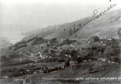 Early photo of Stinson Beach from above looking down on houses nestled on the hillside. Caption in lefthand corner says BIRD'S EYE VIEW OF STINSON BEACH, CA. Written on the photo in ink pen is "Chateau Pioneer" with an X indicating the location of the Harper house high on the hill at 235 Buena Vista.Collection