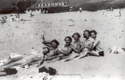 Group of 6 girls in a row sitting front to back (first girl is actually laying stretched out with her head in the lap of the next girl) on the beach in front the Seadowns. Most are all in swimsuits and have their hands on the shoulders of the girl in front. One is waving at the camera (over the leg of the person behind her).Collection
