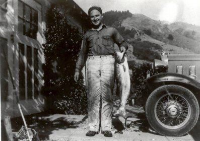 E.G. Harper stands between house and vintage automobile holding a huge striped bass from the Bolinas Lagoon. Hillside in background.Collection