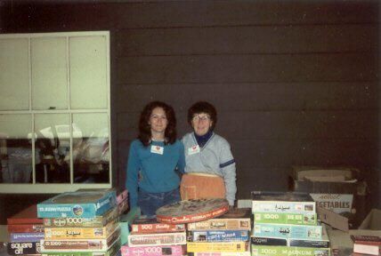 A color photographic print developed from the slide of the corresponding number from Bewley Slide Collection. This photo shows the 1982 Allied Arts Rummage Sale set-up of the Games and Toys Department. It was set under the porch of the Community Center Hall. The workers, Susie Sullivan and Manetta Bennett, stand behind a table full of boxes of games.Collection