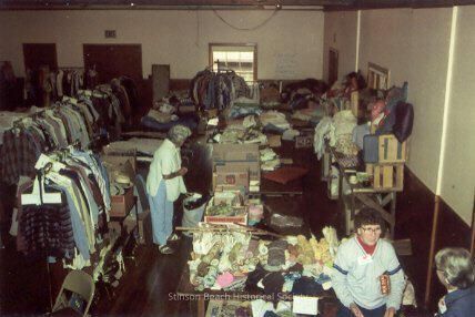 A color photographic print developed from the slide of the corresponding number from Bewley Slide Collection. This photo shows the 1982 Allied Arts Rummage Sale set-up of the aisles and tables of goods. Men's Clothing, Women's Clothing on the left and the Linen Department on the right of the aisle. Manetta Bennett is talking to Betty Oakander in front and Virginia Bewley works in the back.Collection