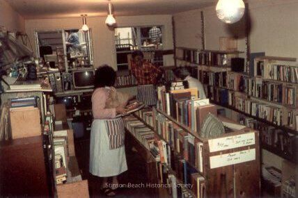 A color photographic print developed from the slide of the corresponding number from Bewley Slide Collection. This photo shows the 1982 Allied Arts Rummage Sale set-up of the Books Department. Three workers are working among the books and book shelves and tables inside of the basement of the chapel. Martha Scarlett is one of the workers in a white sweater.Collection