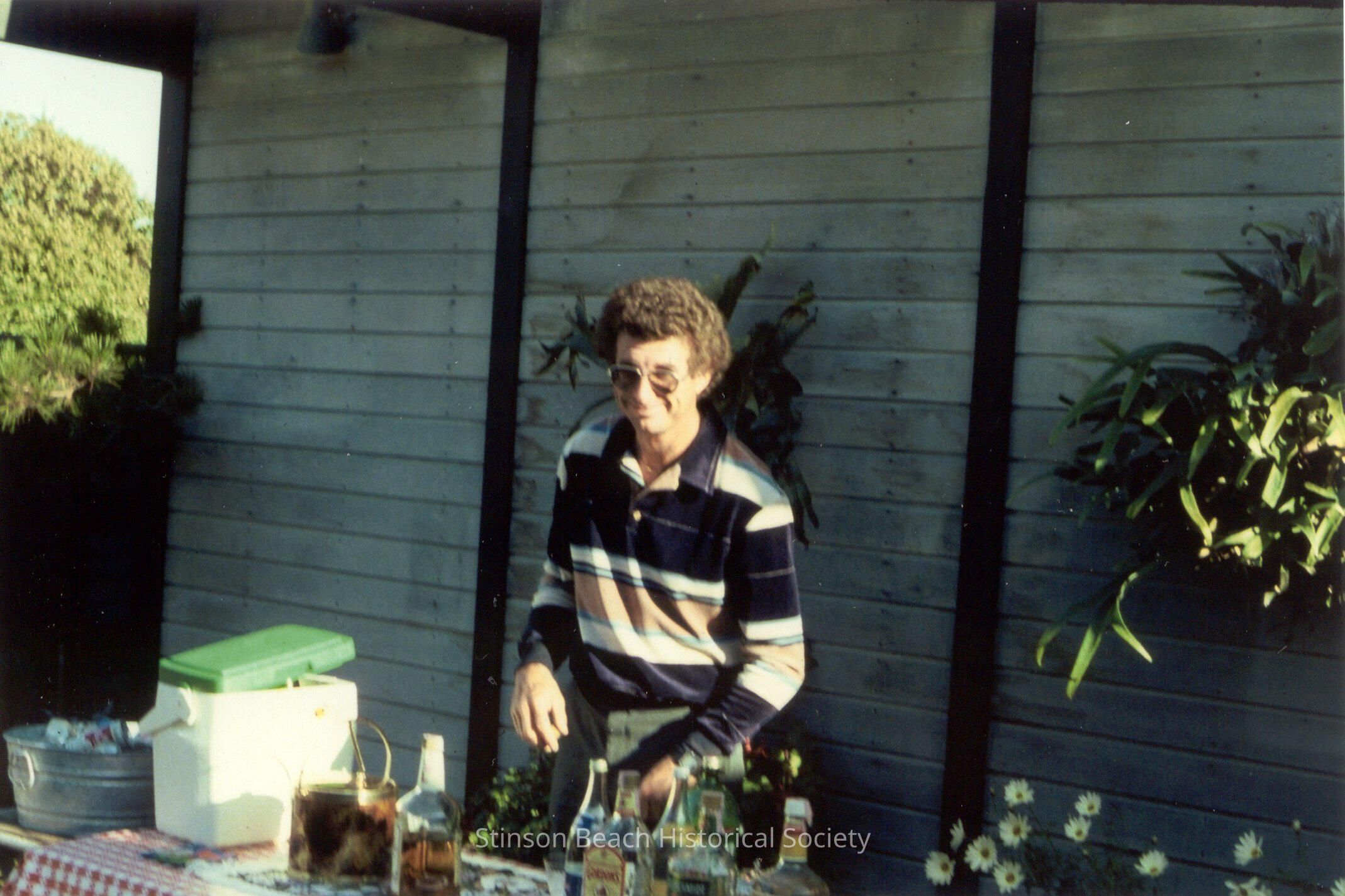 A color photographic print developed from the slide of the corresponding number from Bewley Slide Collection. This photo shows the party for the workers held before the Allied Arts Rummage Sale in 1982 in a home in Seadrift, probably the home of Shirley and Bill Harkness. This photo shows the bar set in the yard against a wall of the house. The "bartender" (name unknown) stands behind a long table of drinks. Rustic wall is gray. Large aloe plant and white African Daisy flowers can be seen on right. The bartender is wearing blue, white and yellow striped shirt.Collection