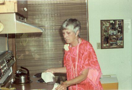 A color photographic print developed from the slide of the corresponding number from Bewley Slide Collection. This photo shows the party for the workers held before the 1982 Allied Arts Rummage Sale in a home in Seadrift, probably the home of Shirley and Bill Harkness. This photo shows Shirley Harkness in front of the stove with pot holders about to pick up something. She is dressed in a flowing red and pink dress with long strands of pearls.Collection