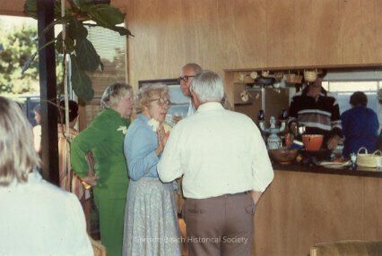 A color photographic print developed from the slide of the correspondent number from Bewley Slide Collection. This photo shows the party for the workers held before the 1982 Allied Arts Rummage Sale in a home in Seadrift, probably the home of Shirley and Bill Harkness. This photo shows 4 people talking in front of the kitchen pass-through windows. In the kitchen, there are 3 people including the bartender. Four people talking are Joyce Moran, Betty Hewlett, unknown person in eyeglasses, and Malcolm Smith's back.Collection