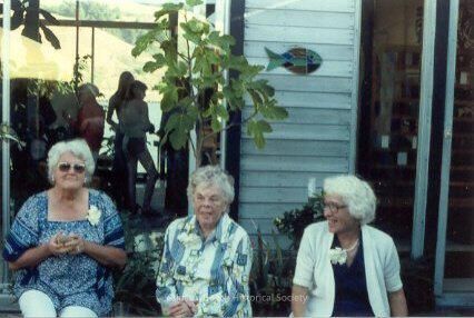A color photographic print developed from the slide of the corresponding number from Bewley Slide Collection. This photo shows the party for the workers held before the 1982 Allied Arts Rummage Sale in a home in Seadrift, probably the home of Shirley and Bill Harkness. This photo shows 3 ladies sitting on the outdoor terrace. Through the sliding glass doors, you can see several people standing and talking inside of the house. The ladies are Virginia Bewley, unknown person in the middle, and Ruth Smith.Collection