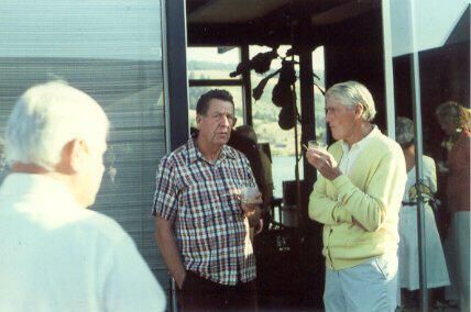 A color photographic print developed from the slide of the corresponding number from Bewley Slide Collection. This photo shows the party for the workers held before the 1982 Allied Arts Rummage Sale in a home in Seadrift, probably the home of Shirley and Bill Harkness. This photo shows John Rusk and Malcolm Smith talking by the doorway leading to the patio.Collection