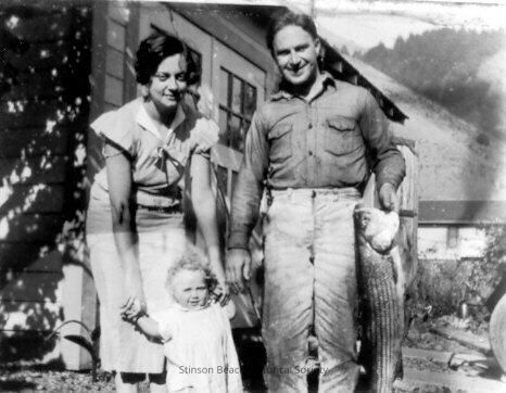 In this black and white photograph a man and a woman are standing side by side. The woman is leaning forward slightly and is holding the hands of a little girl who stands in front of her facing the camera. The man standing beside them is holding a large striped bass in his left hand. There is a house behind them and another house and hills can be seen in the background. See notes.Collection