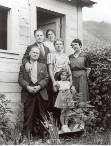 Harper family members (3 women, 2 men and one little girl) stand in a cluster outside the back door of their house in Stinson Beach. They are identified as Regina, Gus, Edward, "Babe," Ann and "Aunt Emily."Collection