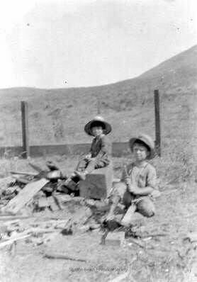 This black and white photograph is of two boys sitting among scraps of lumber. The smaller of the boys (Harold Harper) is sitting on a block of wood, slightly behind the larger boy (Edward) who is sitting on the ground and is holding a tool or a stick in his hands. Both boys are wearing brimmed hats. There is grassland and part of a hill in the background.Collection
