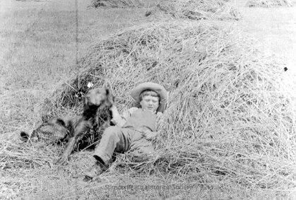 In this black and white photo a boy (Edward Harper) in a wide brimmed hat and overalls is lying sprawled against a haystack with his right hand on a setter-type dog lying beside him.Collection