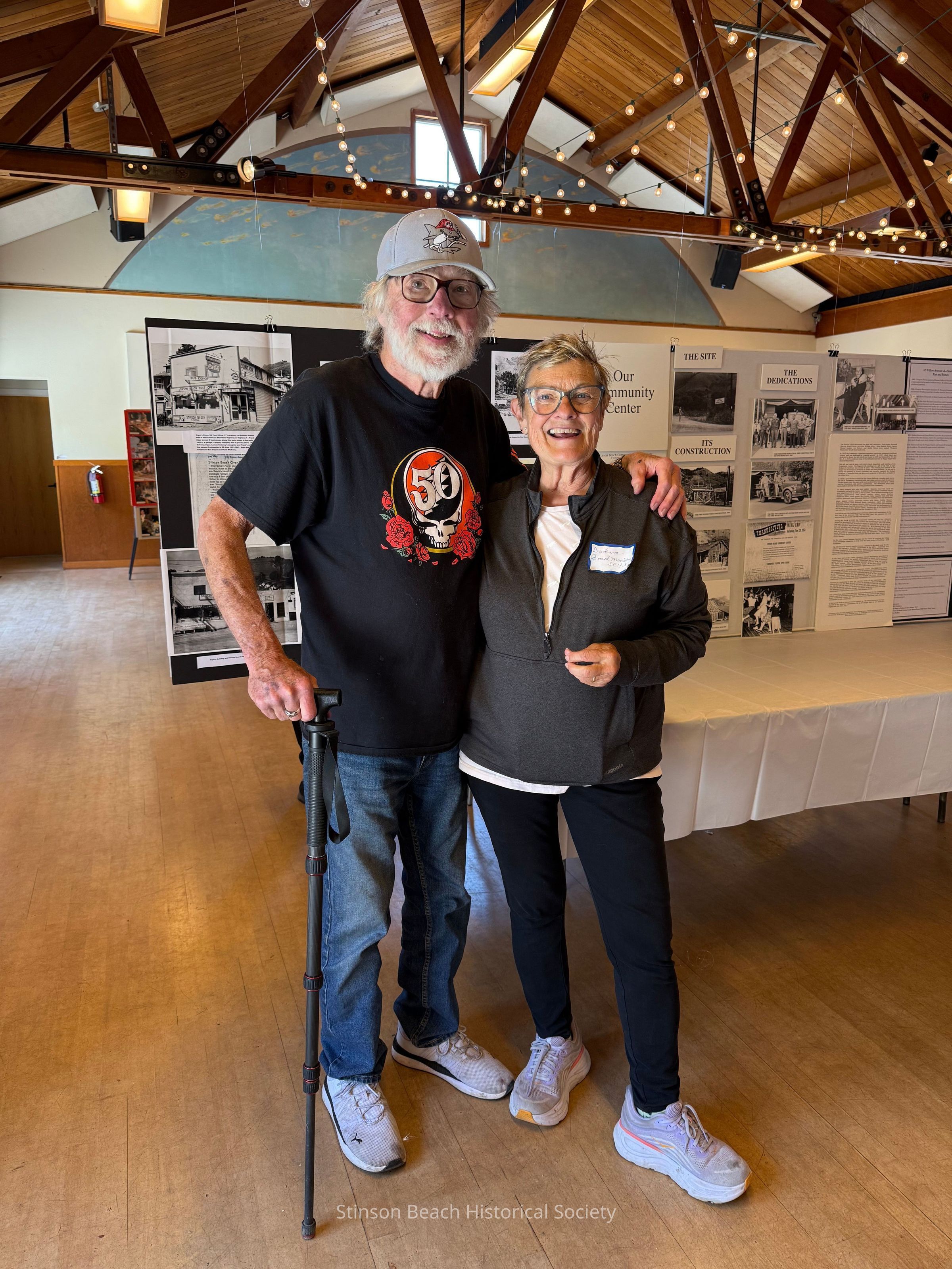 David Conrad (Vice President SBHS) and spouse Barbara Wechsberg (Board Member) in front of construction history of the Community Center. The Center consists of 3 buildings: Fire House #1, Hall and Chapel