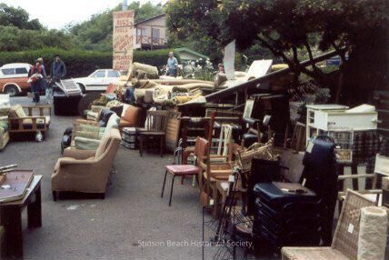 A color photographic print developed from the slide of the corresponding number from Bewley Slide Collection. This photo shows the 1982 Allied Arts Rummage Sale set-up of the Furniture Department at the side of the chapel. It shows number of chairs, armchairs in front, head boards of beds, many rolls of carpet in back. The sign in the back directs with arrows Furniture, Rugs Rolls, Kitchen Gadgets and Appliances and Good Junque.Collection