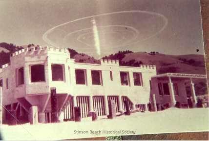 Epperson house on Stinson Beach, known as the Sand Castle. Along with this identifier written on the back of the photo is "Star of the Sea - #1 Pacific Ocean." Above the house is some kind of gaseous weather or aviation phenomenon - a thin spiraling circle with an ascending white vertical stream in the center.Collection