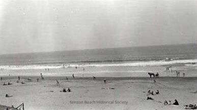 Beach scene looking towards the ocean. There are people in the surf and running on the beach, a few groups of 2 or 3 people sitting on the beach. There is also a horse-drawn one-person carriage standing at the water line.Collection