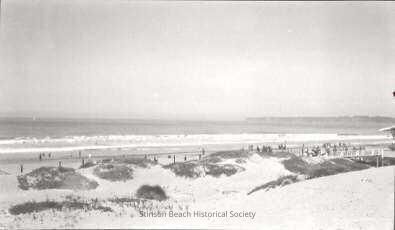 Beach panorama looking from the sand dunes toward the ocean with Bolinas Mesa in the distance. Mostly we see the foliage growing over the dunes, and groups of people on the beach beyond.Collection