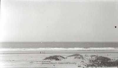 Looking at the ocean past vegetation-covered sand dunes. Photo seems to be taken from the end of a boardwalk visible in the left-hand corner.Collection