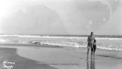 This black and white photograph is of the wet sand of a beach with the white water coming in. At the right a man poses with his hands on the shoulders of a child who stands in front of him.Collection