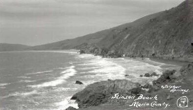 View from the hillside along the shoreline south of Stinson Beach. Waves wash into a cove, where in the distance a small white "x" marks the spot of the sulphur springs. Also written in white in the bottom right corner "Stinson Beach, Marin County.Collection