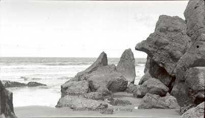 Rocky formations on the sand at the south end of Stinson Beach, looking out towards the ocean.Collection