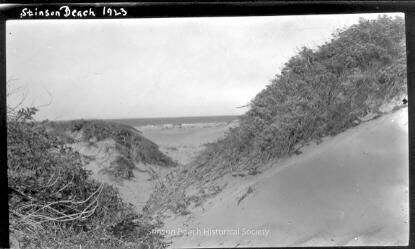 This black and white photograph looks between sand dunes to the surf in the distance. There appears to be a path winding between a high dune on the right and two lower dunes on the left. The dunes have scrubby growth on them. "Stinson Beach 1923' is written in white ink on the upper left black border.Collection