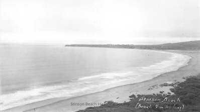 This black and white photograph is a sweeping panorama of the beach on Bolinas Bay. The surf washes against a curve of sand which ends in a long point (Bolinas Point). The sky is overcast. In the right hand lower corner, written in white ink, it says'Stinson Beach