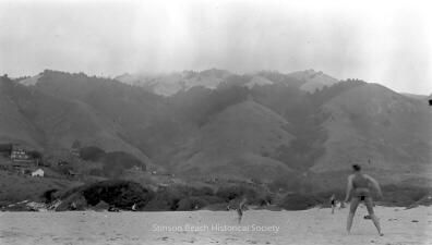 This blackand white photograph is of the beach, taken looking toward the coastal mountains. There is sand in the foreground and at the right side of the picture a man stands with his legs apart and his back to the camera. Farther away, with their backs to the maountains, are two other people. Some houses are visible in the lower hills with the mountains behind dominating the picture.Collection