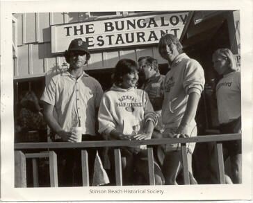 A black and white photograph of 3 locals standing on the deck of Bangalow Restaurant in 1980s. The restaurant was later renamed to Stinson Beach Grill. The three standing are, Toby Bisson, unknown lady and Guy Schwering. Two other coustomers are walking behind them. A large sign board, The Bangalow Restaulant, is on the wall behind of them.Collection