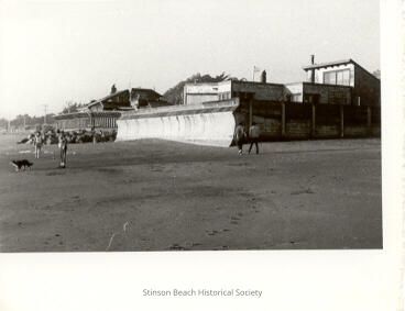 Shows the 2 ocean front houses at the end of Calle del Embarcadero with their sea-walls. The house at far belongs to Bruce and Jean Alexis Smith Watchtell. The house in front belonged to Albertine and Don Reuter at the time. Watchtell's has wooden structure on the concrete base which was remodeled later to the concrete only. It also has rocks in front of the seawall. The sea-wall at Reuter's were built during the storm by Val Agnoli and the crew of carpenters and has the curved front to deflect the wave action. On this clear day when photo was taken, 4 people and a dog play on the sand.Collection