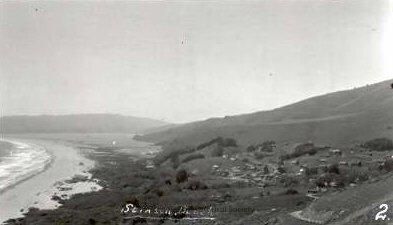 Panoramic view of the hills rising above "Stinson Beach" (which is written on the bottom of the photo in white ink) and beyond, including the Lagoon and Bolinas mesa. Houses dot the hillside, and the roadway is just visible in the bottom righthand corner (where there is also the number 2 written in white ink)..Collection