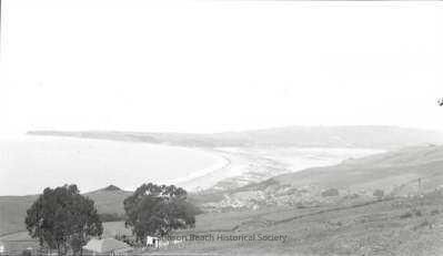 Panoramic view of Stinson Beach from the hillside above White Gate Ranch, identified by the two large trees sheltering the buildings at the lower left corner of photo. Panorama takes in the entire Bolinas Bay, Lagoon and Point.Collection