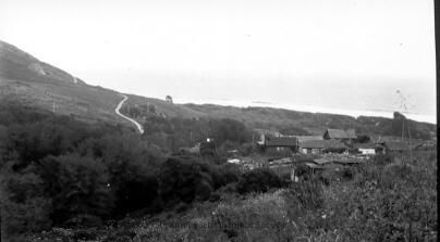 This black and white photo looks down on some houses from a hillside. Beyond them the ocean is barely visible through a haze. There is a road leading up to a ridge beyond the houses.Collection