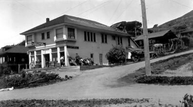 This black and white photograph is of a large two story building on a hillside at the intersection of two roads. The front entrance to the building faces downhill. The entrance is inset under a portico. There are bay windows at the corners above the portico. People are seated around the corner from the entrance at the side of the building. There is a sign on the side of the building that reads 'HOTEL'. There is a sign at the front of the building that reads 'COTTAGES FURNISHED ROOMS'. There is an old car parked at the uphill end of the building and a house uphill from that. There is also a house next to the building on the left. See notes.Collection