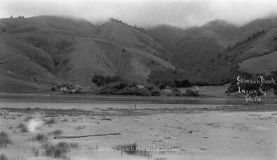 We see Bolinas Lagoon as seen from Sandspit looking at Stinson Beach Ranch at left & Easkoot House and barn to right of this black and white photo. The hills with touches of fog stands behind of the buildings. "Stinson Beach Lagoon and Hills" is written on the right hand side of the photo. The foreground is a mud flat with some grasses.Collection