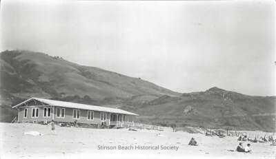 Beach scene of a single one-story building (Dipsea Lodge) sitting on the dunes with the hills forming a backdrop. A few people can be seen sitting on the beach some ways down from the Lodge.Collection