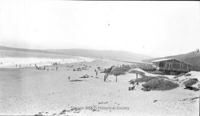 This black and white photograph is taken looking down the length of a beach with the ocean on the left and a building on the dunes on the right. The camera is askew so the horizon line is at an angle. There is a low ridge along the horizon line (Bolinas Ridge). There are fence posts enclosing the dunes and the building (Dipsea Lodge). There is a scattering of people in the water and sitting or lying on the beach (Beach on Bolinas Bay). The sky is overcast.Collection
