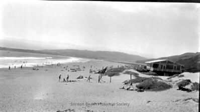 This black and white photograph is almost identical to the previous one (1999-300-01) except it is a darker exposure and there are three people and a dog in the foreground.Collection