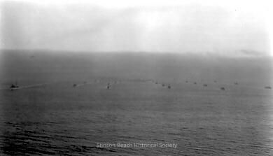 This black and white photo is dark and somewhat over exposed. It is of naval ships on the ocean. There are 20 ships visible and they are in 5 rows of 3 or 4 ships each lined up perpendicular to the camera.Collection
