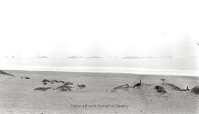This black and white photograph shows about twelve ships just off shore from the beach. The ships are in fog and difficult to discern. There are dunes with some vegetation in the foreground and there is a person sitting in the dunes at the far right. There is a T shaped sign on top of a dune to the left of the person.Collection