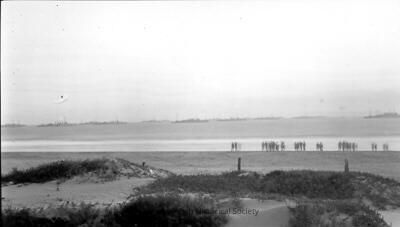 There are twenty three figures in silhouette lined up at the water line on the right side of the photo. The foreground is dunes with vegetation.Collection