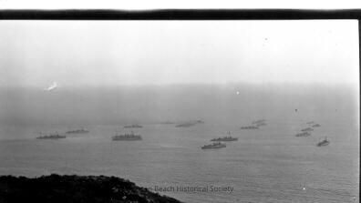 This black and white photo is similar to 1999-302D-01 except there are fewer ships visible due to a fog bank just beyond the shore.Collection