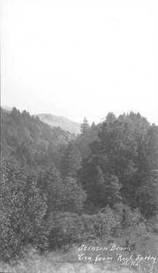 This black and white photograph depicts hilly terrain covered with brush and trees with a bare hill in the background. 'Stinson Beach view from Rock Spring Hills' is written in white ink at the bottom of the picture.Collection