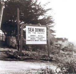 Black and white photographic print of the Sea Downs sign. On the back of the photo is written: From Dennis Mayfield Jan 07 Photo taken circa 1955 of Highway 1 sign leading to Sea Downs Resort. Sign painted by Jim Benn. The sign reads: SEA DOWNS on the Pacific, DINING ROOM Seafood-Short orders, BEACH CABINS, COMPLETE BEACH FACILITIES. The sign is placed probably at or near the present GGNRA southern utility road just north of the junction of Panoramic Highway. The 2-story building in the back is the rear of the motel. Monterrey Cypress hedge is along the road leading to the Sea Downs.Collection
